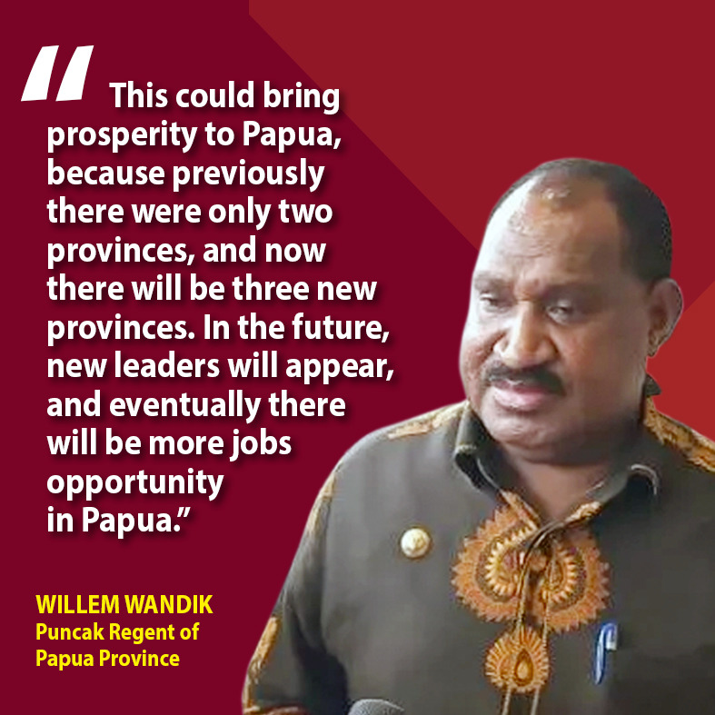 “This could bring prosperity to Papua, because previously there were only two provinces, and now there will be three new provinces. In the future, new leaders will appear, and eventually there will be more jobs opportunity in Papua,” he said.